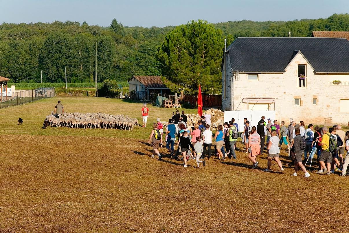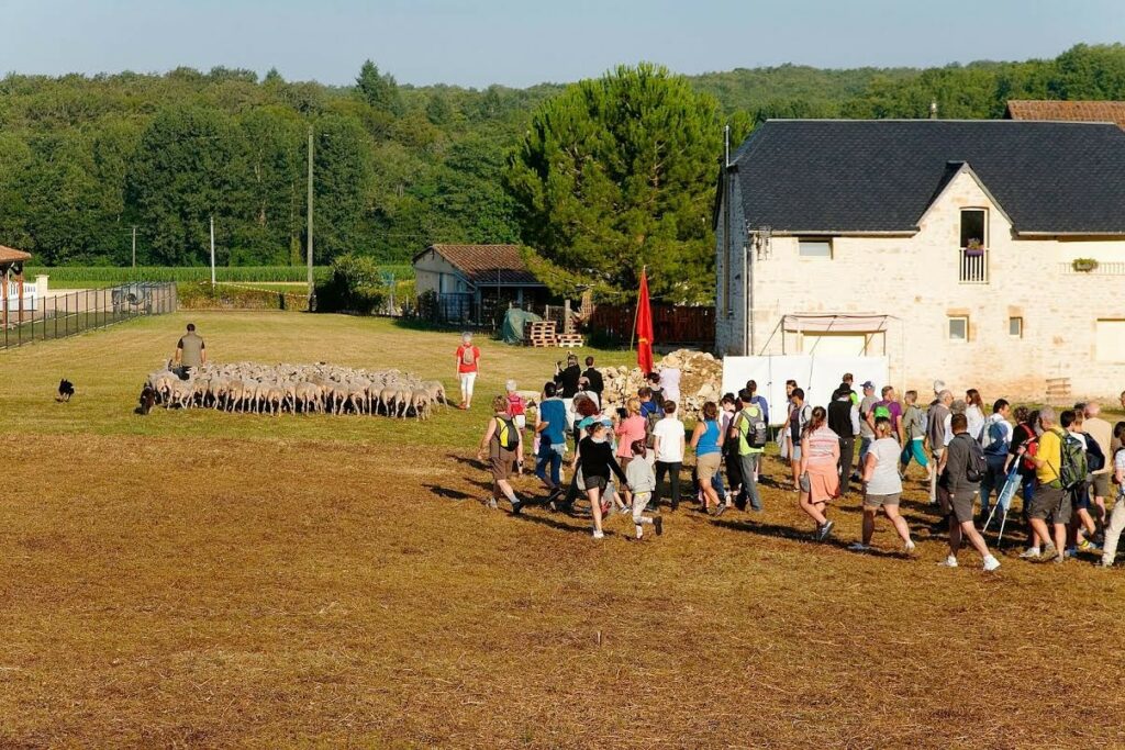 Ils étaient bien là, les quatre cents randonneurs aux Péricoux, à Condat-sur-Vézère, ce dimanche matin 24 juillet, pour attendre la centaine de moutons de Thierry Delpech ! Ceux-ci avaient passé la semaine qui précédait au-dessus du hameau, dans un terrain nettoyé de quelques arbres au printemps dernier. De la musique, des drapeaux et des T-shirts occitans en nombre, des battons de marche et des marcheurs faisant des étirements, des caméras, des appareils photo, tout cela pour accompagner ce maigre troupeau venu de Proissans pour l’occasion, et où il repartira une fois la fête terminée. Hélas, bien clairement exprimée, la demande d’attacher les chiens était loin d’être respectée. Vous pensez, attacher un presque membre de la famille, même si c’est un border collie ?…