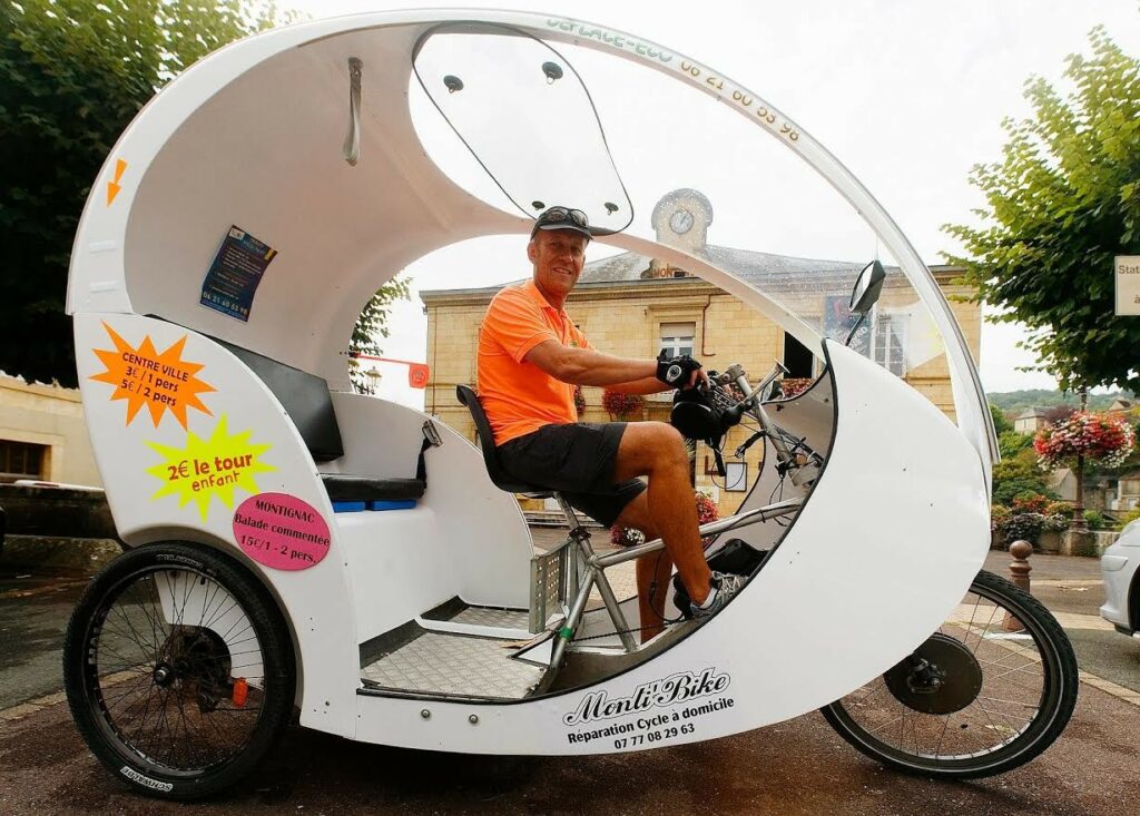 Déplace-Éco, pour vos déplacements et vos livraisons à Montignac… Depuis le 22 juillet, un étrange tricycle parcourt Montignac, on le voit même dans les plus petites ruelles. Il s’agit de Pascal Choffat qui est Montignacois depuis dix ans. Il a choisi de développer une activité de taxi et transport basée sur des véhicules légers à propulsion électrique et humaine.