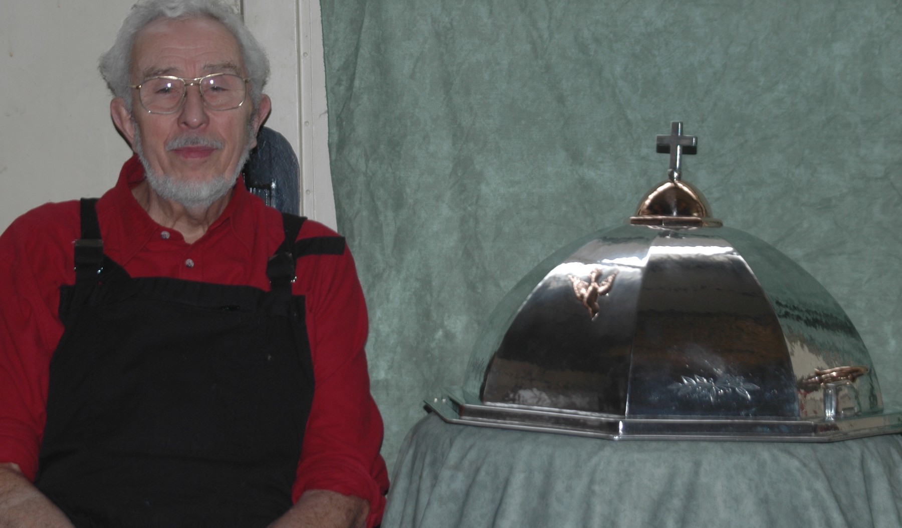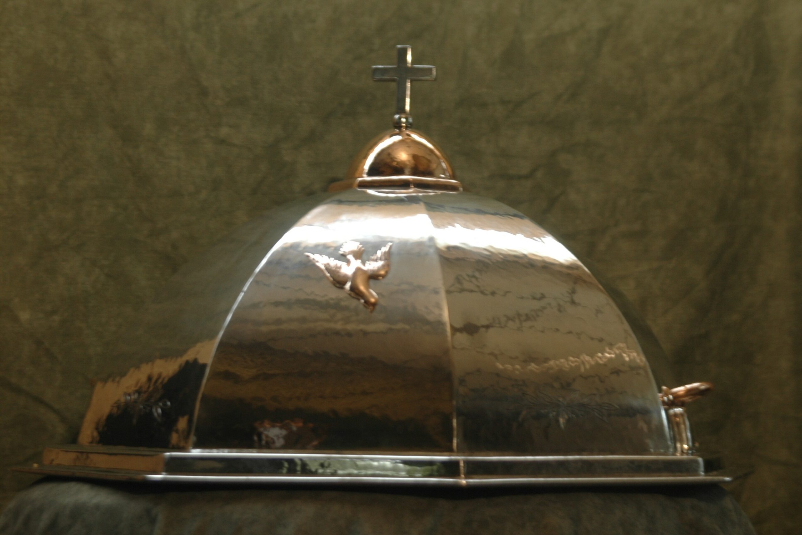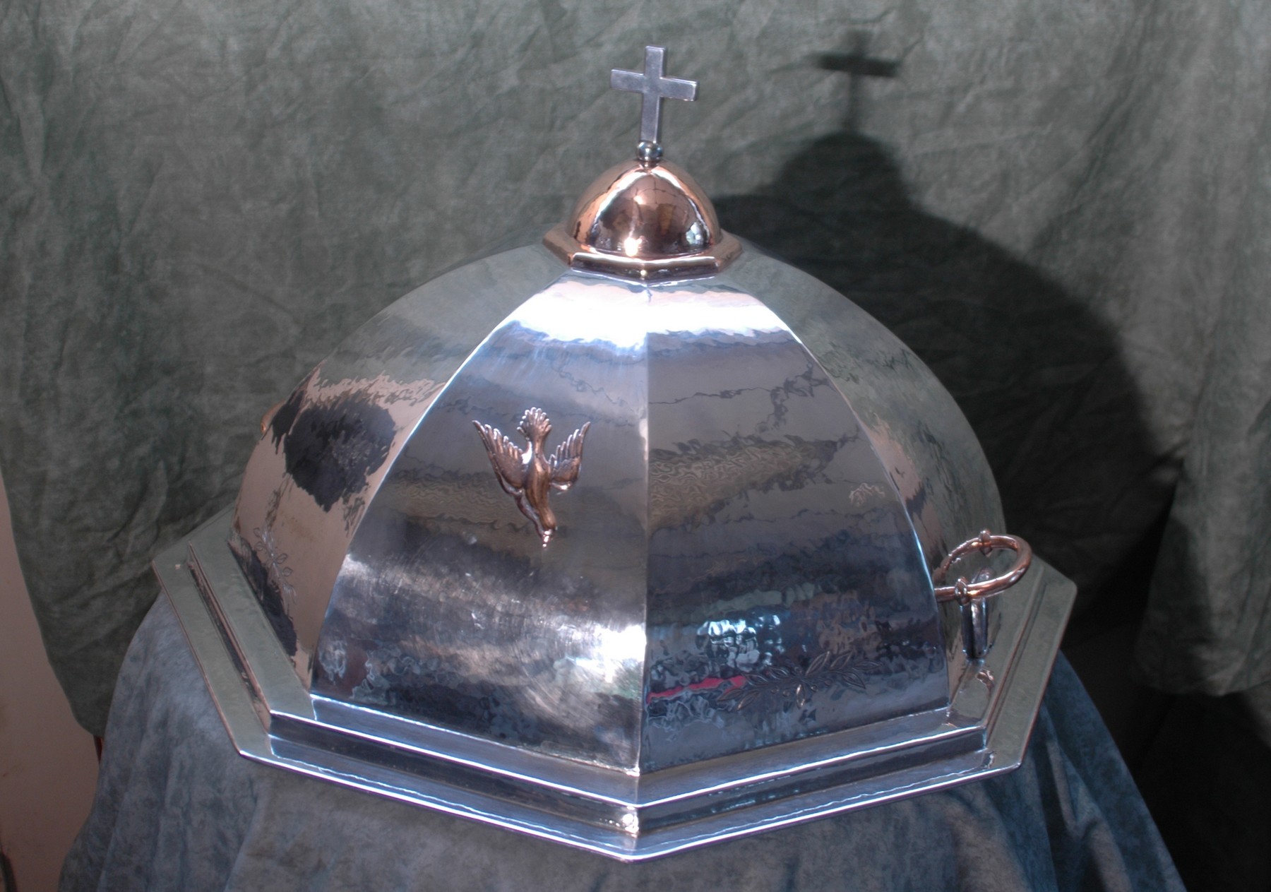 « Ne pouvant trouver de bronze de la même couleur que l’ogive, j’ai dû recouvrir un rond d’acier inox d’une feuille de bronze, ainsi j’avais la solidité et une couleur bronze assortie. Juste en dessous de ces deux poignées, une serrure dissimulée sous un cache en étain massif permet d’assurer la sécurité. Quatre des faces hexagonales du dôme sont décorées à leur base d’un discret rameau d’olivier ciselé ; c’est seulement lorsque j’ai eu terminé la ciselure qu’en la contemplant, le Compagnon du Tour de France que je suis a été étonné par le symbolisme que j’avais dessiné sans le vouloir. Cinq olives à chaque motif, c’est le chiffre du Compagnon fini et neuf feuilles d’olivier, c’est le chiffre du Compagnon fini c’est à dire le maître, devinez ma surprise ! La face avant est décorée d’une colombe en feuille de bronze sculptée en relief pour évoquer le Saint Esprit directement inspiré des gravures évoquant le baptême du Christ. La feuille d’étain n’étant pas suffisamment résistante pour constituer un tel objet, j’ai dû réaliser une structure pour servir de support, la base de cette structure est en acier inoxydable pour éviter le risque de rouille au contact avec la pierre et le dôme est en tôle d’acier peinte. La feuille d’étain martelée est venue ensuite recouvrir l’ensemble. »