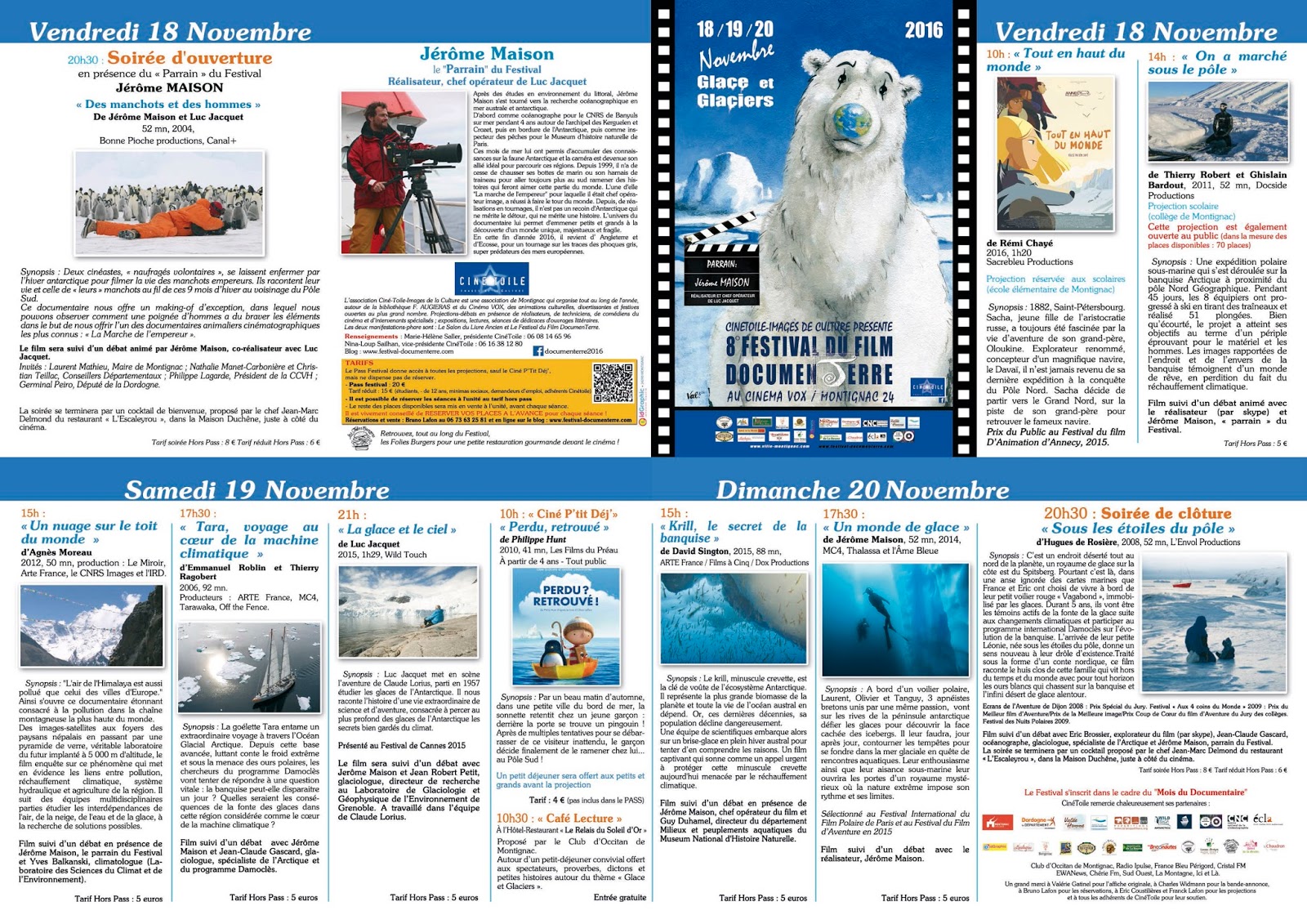 La 8ème édition du Festival de films documentaires, Documen’Terre, organisée par l’association Ciné-Toile se déroule du vendredi 18 au dimanche 20 novembre 2016 à Montignac. Une édition glaciale avec du blizzard, de la fonte de calotte arctique et des glaciers, la lutte des hommes qui vont explorer ces milieux hostiles et fragiles, des territoires de froid, mais pas assez froids. De belles images bleues dont le but est d’ouvrir les yeux aux spectateurs sur les enjeux du réchauffement climatique et de la pollution.