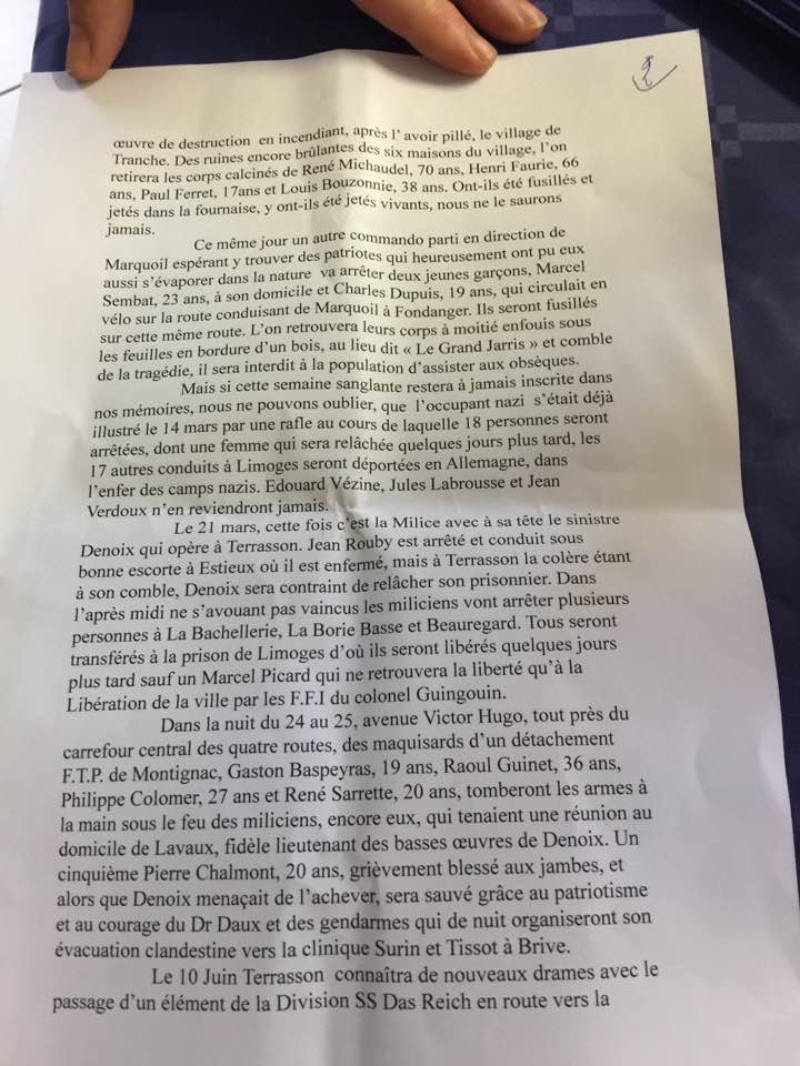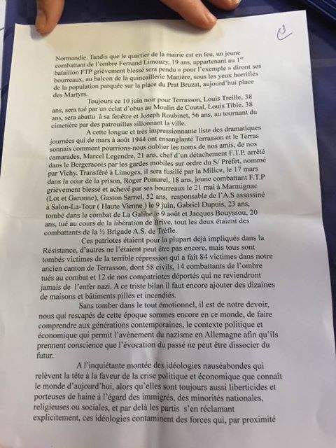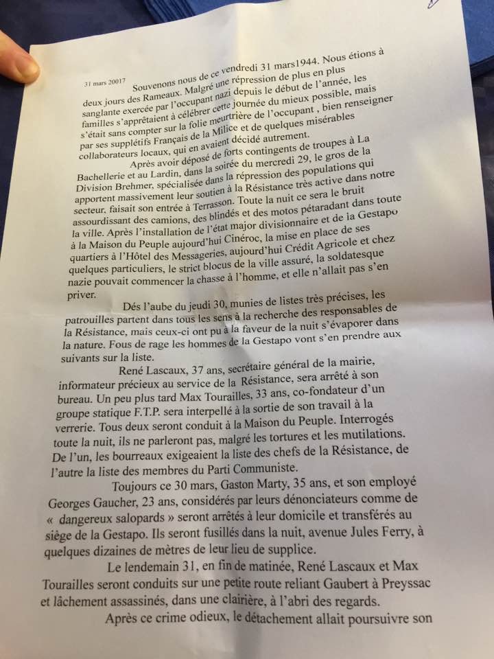 Chaque 31 mars, la ville de Terrasson rend hommage aux martyrs de la Libération et aux héros de la Résistance… Cette année 2017, l’ancien résistant Lucien Cournil a retracé la sombre histoire du 31 mars 1944 à Terrasson dans un discours poignant (On peut déjà trouver son discours 2015 sur Ewanews). Ici, nul n’oubliera René Lascaux, Max Tourailles, Gaston Marty, Georges Gaucher, René Michaudel, Henri Faurie, Paul Ferret, Louis Bouzonnie, Marcel Sembat, Charles Dupuis, Edouard Vezine, Jules Labrousse, Jean Verdoux, Gaston Baspeyras, Raoul Guinet, Philippe Colomer, René Sarrette, Fernand Limouzy, Louis Treille, Louis Tible, Joseph Roubinet, Marcel Legendre, Roger Pomarel, Gaston Sarnel, Gabriel Dupuis, Jacques Bouyssou…