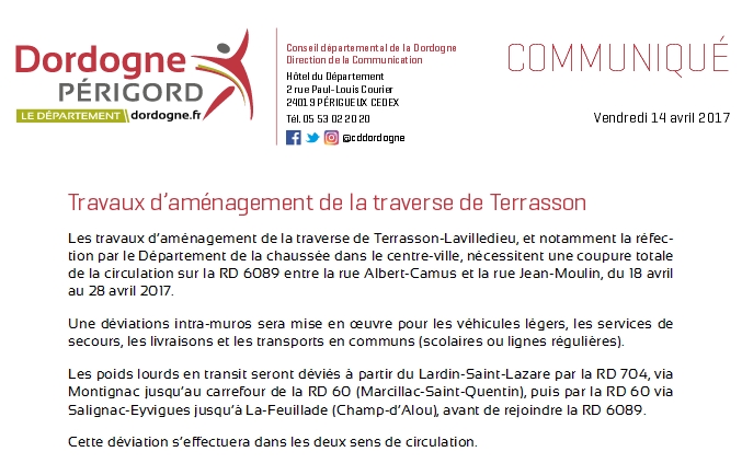 L’info du 17 avril. Une coupure totale de la circulation dans les deux sens aura lieu cette semaine sur la RD 6089 (traversée de Terrasson), entre la rue Albert-Camus et la rue Jean-Moulin, du 18 avril au 28 avril 2017. En raison des travaux d’aménagement et notamment la réfection de la chaussée par le Département, une déviation intra-muros sera mise en œuvre pour les véhicules légers, les services de secours, les livraisons et les transports en communs (scolaires ou lignes régulières). Les poids lourds en transit seront déviés à partir du Lardin-Saint-Lazare par la RD 704, via Montignac jusqu’au carrefour de la RD 60 (Marcillac-Saint-Quentin), puis par la RD 60 via Salignac-Eyvigues jusqu’à La-Feuillade (Champ-d’Alou), avant de rejoindre la RD 6089. Cette déviation s’effectuera dans les deux sens de circulation.