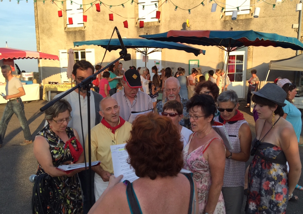 Article et photos de l’été 2015. De longues tables sous toile installées au pied de l’église qui domine le coteau, chacun a trouvé sa place pour déguster son repas. De nombreux producteurs sont là : boucher, boulanger, pâtissier, fromager, boissons, frites, glaces… Le premier marché nocturne de Châtres était très réussi le lundi 6 juillet 2015. La chorale occitane de Condat-Terrasson menée par Félicie Verbruggen a apporté sa couleur joviale et guillerette à la soirée. Les participants venaient pour beaucoup de villages environnants, les touristes n’étant pas encore arrivés en masse…