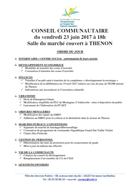 Vendredi 23 juin 2017 à 18 heures, à Thenon, salle du marché couvert, le conseil communautaire du Terrassonnais-Thenon-Hautefort a porté sur les sujets suivants : développement économique transfert et entretien des zones d’activités ; finances subventions associations et convention culturelle ; urbanisme droit de prééemption urbain ; modification du PLU Montagnac d’Auberoche ; ordures ménagères statuts du SMD3, adhésion du secteur de Thenon ; marchés publics : marché fauchage-débroussaillage, signalétique Grand site Vallée Vézère, charte zéro pesticide ; gestion du personnel taux de promotion et tableau d’effectifs ; vie de la communauté création du conseil de développement ; remplacement d’un memebre du CA du CIAS ; questions diverses.