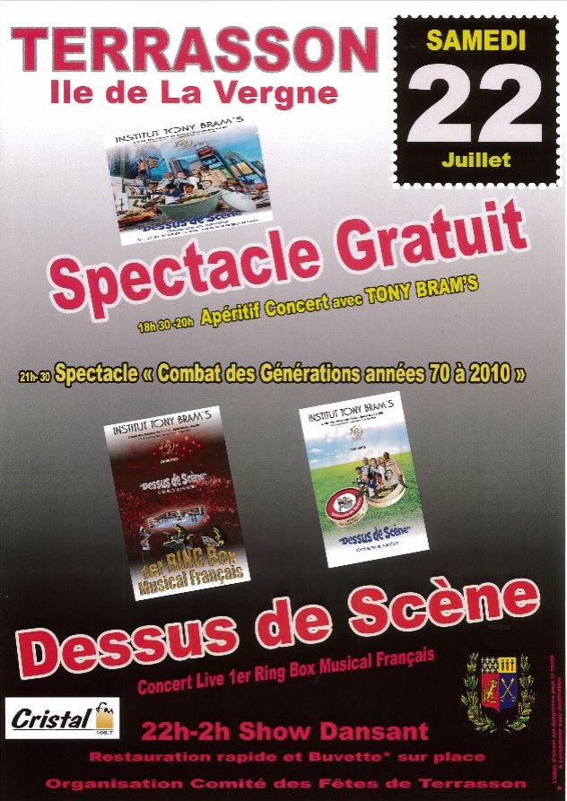 Samedi 22 juillet à partir de 19h, à Terrasson, île de la Vergne, une grande soirée musicale gratuite est proposée par le comité des fêtes qui reçoit l’orchestre rebaptisé Dessus de Scène (concert Live Ring Box Musical français) dans un show dansant de 22h à 2h qui suivra un spectacle à 21h30 : « Combat des Générations années 70 à 2010 », et un apéritif-concert avec Tony Bram’s. Restauration rapide sur place.