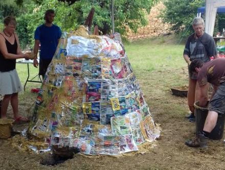Samedi, la construction d’un four papier (photo 1) a eu lieu avec l’atelier « La terre en feu » (de Valojoulx). Un four médiéval a été mis en place également pour une cuisson de poteries modelées par les élèves de l’école primaire, et ceux du collège, une cuisson de poteries tournées en argile de Beauregard.