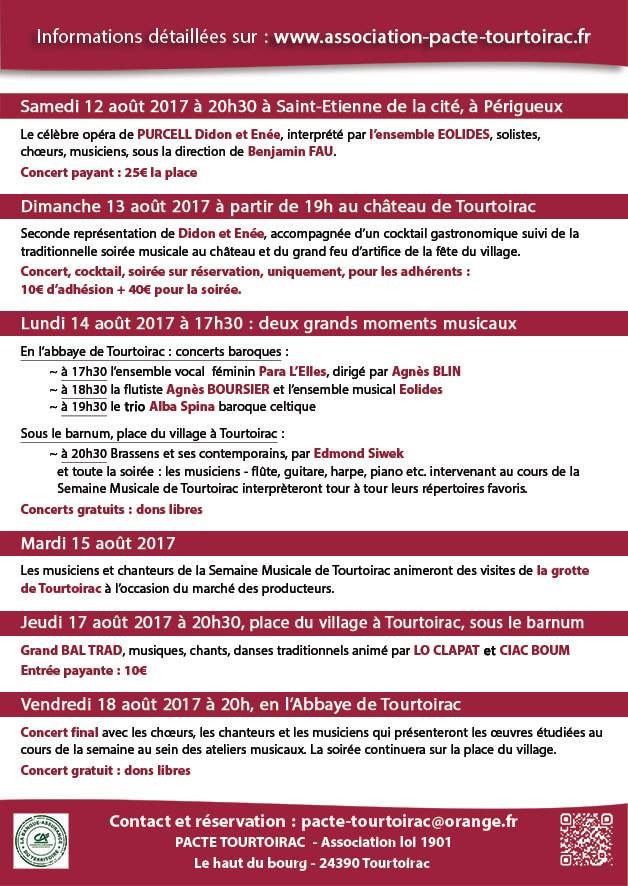 lundi 14 août à 17h30, des concerts baroques gratuits ont lieu, dans le cadre de la Semaine Musicale, en l’église avec l’ensemble vocal féminin Para L’Elles dirigé par Agnès Blin, à 18h30 avec la flûtiste Agnès Boursier et l’ensemble musical Eolides, et à 19h30 avec le trio Alba Spina, c’est du baroque celtique. Ce soir lundi également à 20h30 sous barnum sur la place du village de Tourtoirac, une soirée sur le thème « Brassens et ses contemporains », dirigée par Edmond Siwek, avec des musiciens flûte, guitare, harpe, piano qui interpréteront tour à tour leur répertoire favori. Ces concerts sont gratuits et les dons sont libres.