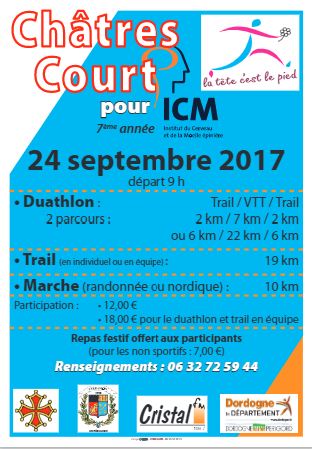 La journée sportive du dimanche 24 septembre 2017 à Châtres est dédiée à l’ICM (Institut du Cerveau et de la Moëlle épinière). Ce « Duathlon Vert » comprend deux parcours de Trail-VTT-Trail (2, 7 et 2 km ; 6, 22 et 6 km), un parcours de trail de 19km, et une randonnée pédestre ou une marche nordique sur le même parcours. Le rendez-vous de l’association La Tête C Le Pied a lieu place de l’église. Le départ aura lieu à 9h. La participation est de 12€, repas compris, ou de 18€ pour le duathlon et le trail par équipe. Tél. 06.32.72.59.44