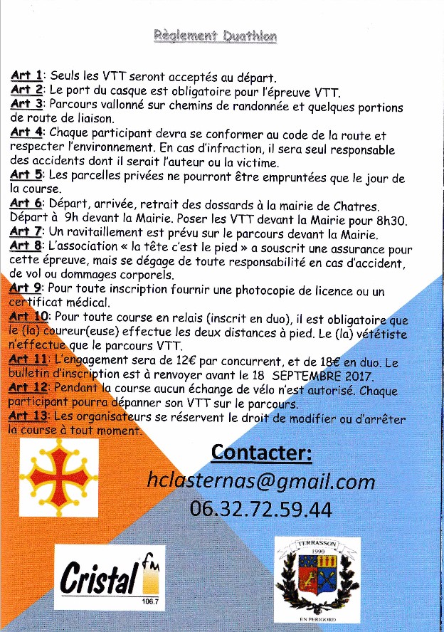 Le 7e duathlon vert de Châtres aura lieu dimanche 24 septembre au profit de la bonne cause. L’association La Tête C Le Pied reversera tous les bénéfices à l’ICM (Institut du cerveau et de la moëlle épinière). Trail, VTT, randonnée pédestre et marche nordique au programme… Deux parcours: trail-VTT-trail sont proposés (XS: 2 km/7 km/2 km et M: 6km/22 km/6 km), un parcours trail de 16 km en solo ou en duo avec un relais au 8ekm. La randonnée est de 10 km. Tarif 12 € ou 18 € pour le duathlon par équipe. Tél. 06.32.72.59.44 ou hclasternas@gmail.com