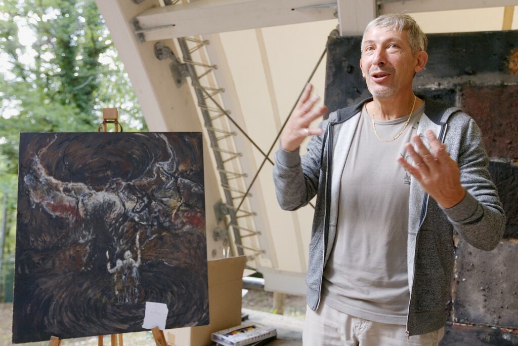 Réfugiés sous les abris du site, il pleuvait, mais les artistes ont œuvré malgré tout durant trois heures sous les regards des quelques visiteurs du site et des membres de l’association. Étaient présents, pour ce qui devrait être la première édition (Thierry Félix évoque la présence de dessinateurs de bandes dessinées pour l’année prochaine) : Margot Aït Kaci, Philippe Bigotto, Françoise Gallet, Julie Gaulom, Gilles Lafleur, Frédéric Mathieu, Dominique Oriol et Didier Sebastianutti. Suivent les images de chaque artiste au travail, puis présentant leurs œuvres avant le vote du public.