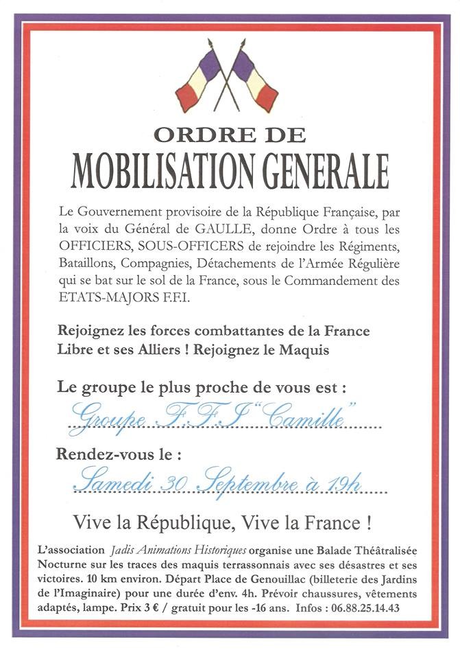 Une balade maquisarde théatrâlisée en nocturne est proposée le samedi 30 septembre 2017 à 19h à Terrasson, départ devant la billetterie des jardins de l’Imaginaire place du Foirail (place de Genouillac). Encadrée par l’association Jadis Animations Historiques avec le soutien de l’Office de Tourisme Vézère Périgord Noir, cette balade sur le thème des maquis sera un parcours historique d’une dizaine de kilomètres retraçant une partie de l’aventure des maquis et groupes de résistants du secteur de Terrasson et Condat sur Vézère en juillet 1944, alors que la France commence sa libération. En compagnie du corps franc du groupe FFI « Camille » (groupe imaginaire créé pour l’occasion), le public découvrira la vie de ces hommes et de ces femmes qui ont fait le sacrifice de leur jeunesse pour la plus noble des causes… Le visiteur fera la connaissance du lieutenant Camille, le Terrassonnais, de Fernand le métallo parisien, d’Albert l’apprenti cheminot du Lot, de Diégo le réfugié espagnol, ou encore de Lucienne la jeune paysanne agent de liaison.