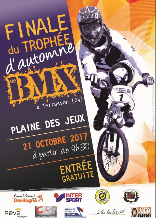 La finale du trophée d’automne Nouvelle-Aquitaine de BMX aura lieu à Terrasson, à la piste de BMX, plaine des jeux à l’entrée ouest de la ville, le samedi 21 octobre 2017 à partir de 9h30. Le club de BMX de Terrasson remettra une récompense aux trois premiers pilotes de chaque catégorie. Le comité d’Aquitaine récompensera les trois premiers pour le classement par catégorie des trois trophées d’automne. L’accueil des pilotes aura lieu dès 8h30 le samedi matin. Les exposants et camping-cars le vendredi dès 17h30. Les concurrents engagés ont de 6-7 ans à 30 ans et plus. Chez les filles, les benjamines et minimes. Les Cruisers dames toutes catégories, espoirs minimes jusqu’à 29 ans, seniors de 30 à39 ans et vétérans de 40 ans et plus… Samedi matin à 10h, place aux cruisers jusqu’à benjamins pour les essais, les manches qualificatives, les quarts, demi-finales et finales, puis l’après-midi place aux minimes et plus. Une restauration rapide est prévue sur place.