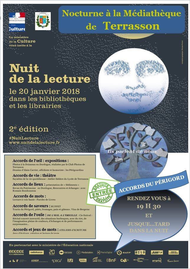 La 2ème nuit de la lecture aura lieu le samedi 20 janvier 2018 dans les bibliothèques et les librairies, avec le ministère de la Culture… Une nocturne aura lieu à la médiathèque de Terrasson à partir de 19h30 avec l’affichiste et humoriste Alain Carrier, en présence du club photos de Terrasson, avec la participation de Romain Bondonneau de la Revue du Patrimoine en Dordogne, lors d’un buffet avec lectures à voix haute, un récital-concert interactif de la Cie Estival, l’atelier théâtre du lycée, le tout couronné d’ateliers d’écriture…