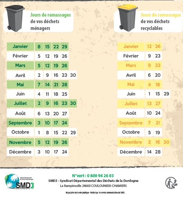 Ramassage des ordures ménagères. Pour le SMD3, soit sur les communes d’Ajat, Auriac, Azerat, Bars, Beauregard, Coly, Fossemagne, Gabillou, Limeyrat, Montagnac d’Auberoche, Peyrignac, Sainte-Orse, Thenon et Villac, depuis le 8 janvier 2018, le ramassage des ordures ménagères (bacs sombres seulement) a lieu tous les lundis et la collecte des déchets recyclables (bacs jaunes) a lieu un vendredi sur deux.