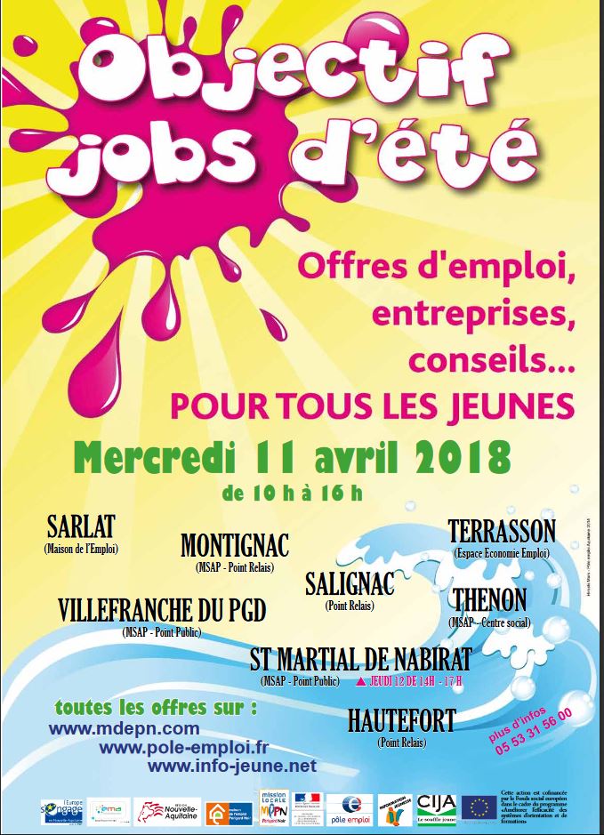 Quelles sont les offres d’emploi à pourvoir pour cet été ? Une journée spéciale « Jobs d’été » aura lieu le mercredi 11 avril 2018 de 10 h à 16 h, simultanément à Terrasson, Montignac, Hautefort, Thenon, Sarlat… L’entrée sera libre et sans inscription. Les jeunes pourront rechercher des offres d’emploi au local et au national en fonction des souhaits et de leur mobilité, ainsi que créer des curriculum vitae ciblés et bénéficier de conseils pour la rédaction de lettres de motivation. Les jobs d’été en Périgord Noir concernent essentiellement les structures ayant une activité liée au tourisme, tels que les campings, les hôtels, les restaurants et les sites touristiques.
