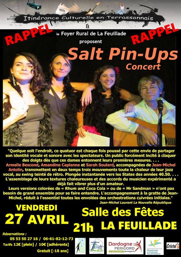 Vendredi 27 avril 2018 à 21 heures à La Feuillade, salle H. Froidefond : « Salt Pin’Ups » en concert, du jazz vocal des années 40-50… Trio de filles, 3 voix qui s’accordent et se frottent dans l’éclosion du swing avec Itinérance Culturelle en terrassonnais. Armelle Bescond, Amandine Caplanne et Sarah Soulard sont accompagnées de Jean-Michel Antolin à la guitare, pour une plongée instantanée dans la musique des années 40-50. Les Salt Pin-Ups, unis depuis 2011, sillonnent les petites salles et le quatuor est à chaque fois poussé par une envie de partager son identité vocale et sonore avec les spectateurs. Un public forcément incité à claquer des doigts dès que ces dames entonnent leurs premières mesures. Les Salt Pin-Ups revisitent avec entrain des standars, ceux des Andrew Sisters, notamment. Les trois chanteuses et le guitariste vendéen, professeur depuis de nombreuses années, unissent leur talent jusque dans quelques festivals plus renommés comme Jazz sous les Pommiers à Coutance dans la Manche. Leurs versions colorées de « Rhum and Coca Cola » ou de « Mr Sandman » n’ont pas besoin de grand ensemble pour se faire entendre. Un album CD de douze titres autoproduit tiré à 500 exemplaires retrace les principaux titres interpertrés lors de leur concert.