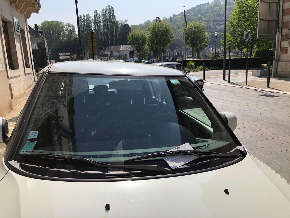 – Photo : une voiture stationnée « sans disque bleu » rue Aristide Briand à Terrasson, ce mardi matin 24 avril 2018, entre le Crédit Agricole et la salle des fêtes…