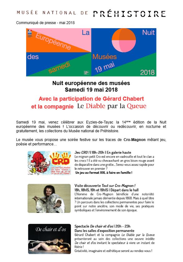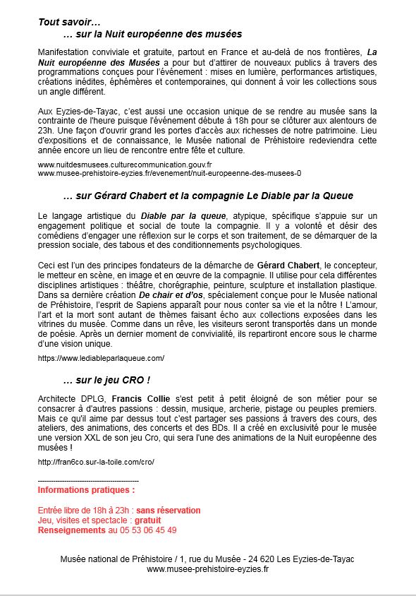 • 20h Montignac Lascaux : Nuit Européenne des Musées, 5€ les 30 mn de visite à 20h ou 20h30, pour réserver ;