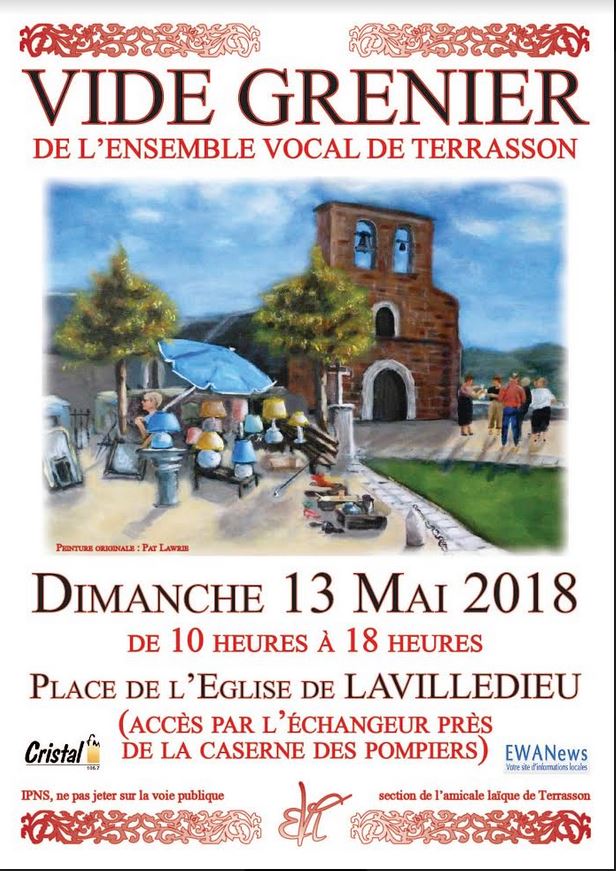 L’Ensemble Vocal de Terrasson (EVT) organise son traditionnel vide-greniers, le dimanche 13 mai 2018 toute la journée à Lavilledieu, village inclus dans la commune de Terrasson. De 9 heures à 18 heures, les choristes qui vont installer bibelots, vaisselle, livres et autres objets sur le parvis de l’église, espèrent une belle journée et un public nombreux.
